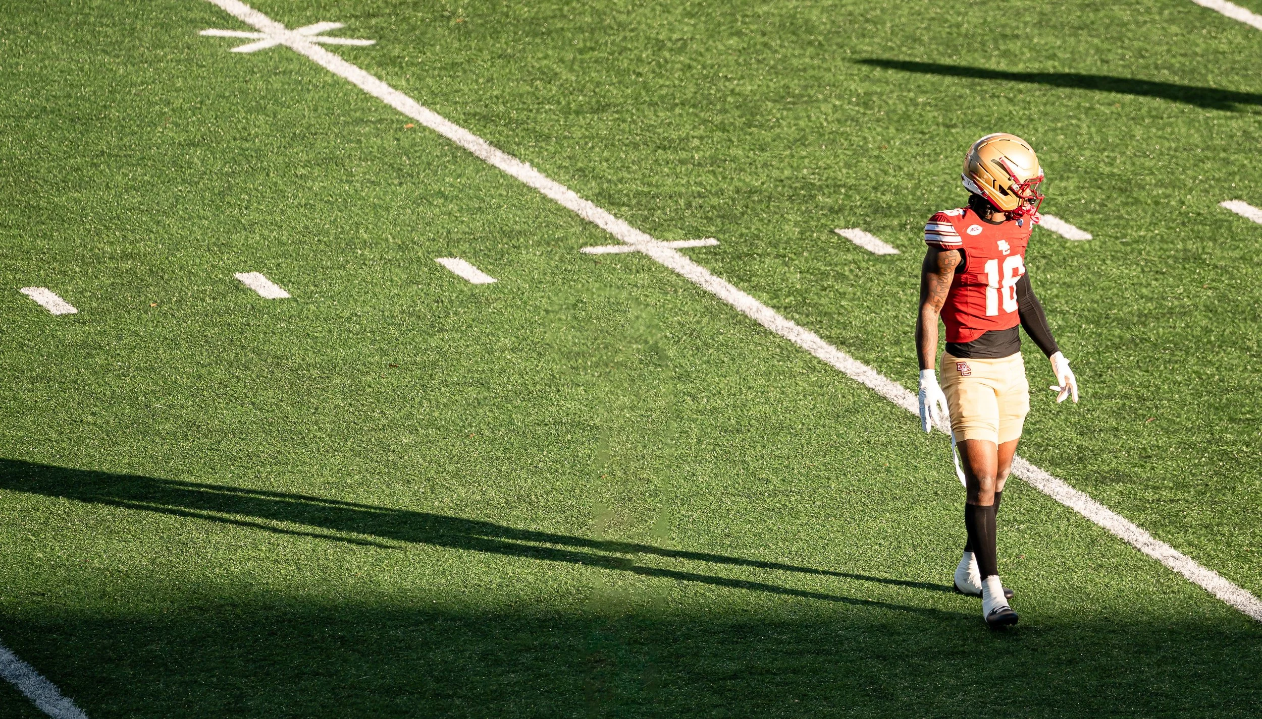 CHESTNUT HILL, MASSACHUSETTS - NOVEMBER 1: Isaiah Farris #16 of Boston College Football walks across the field during the team’s game against Notre Dame at Alumni Stadium on November 1, 2025 in Chestnut Hill, Massachusetts. (Photo by Max Elliot/Boston College Football)