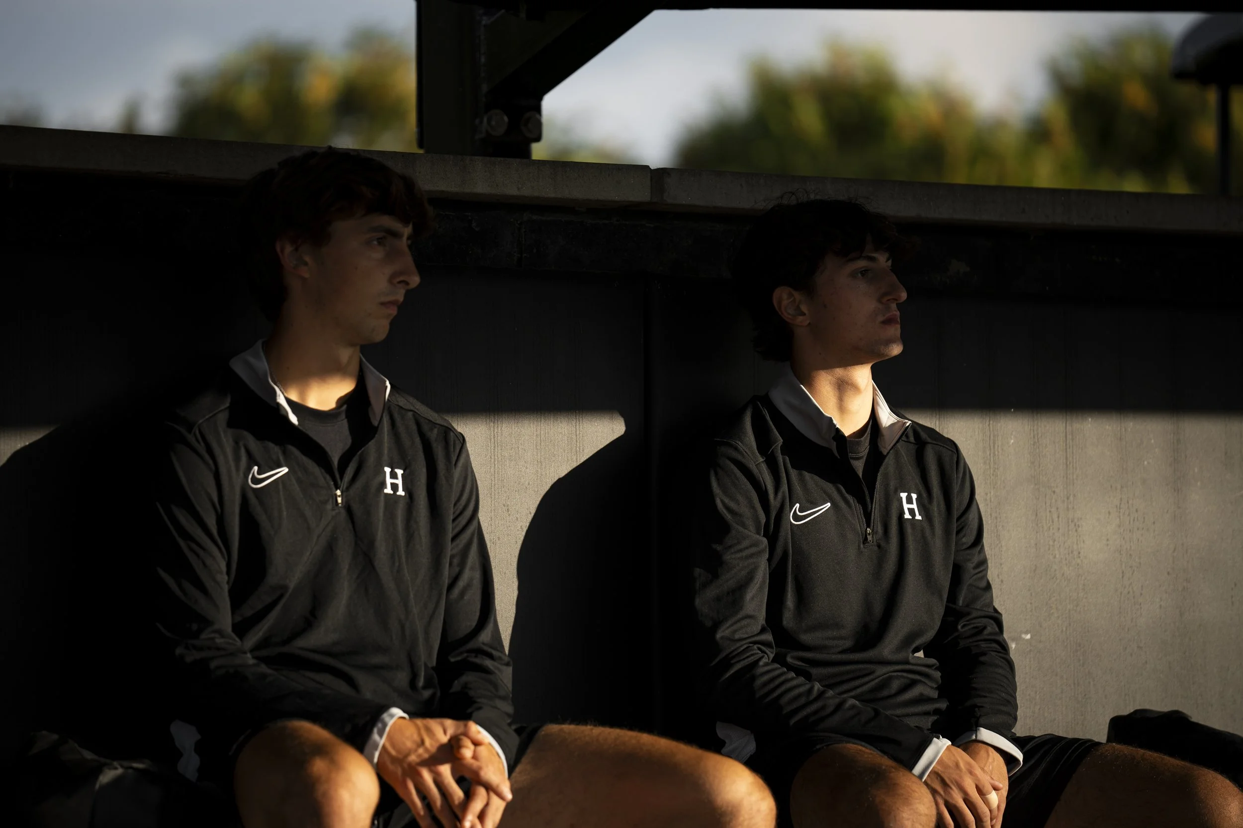 CAMBRIDGE, MASSACHUSETTS - SEPTEMBER 10: Ricardo Rollo #33 and Marcos Ojea Quintana #10 of Harvard Men’s Soccer sit on the bench ahead of the team’s matchup against Cal at Jordan Field on September 10, 2025 in Cambridge, Massachusetts. (Photo by Max Elliot/Harvard Athletics)